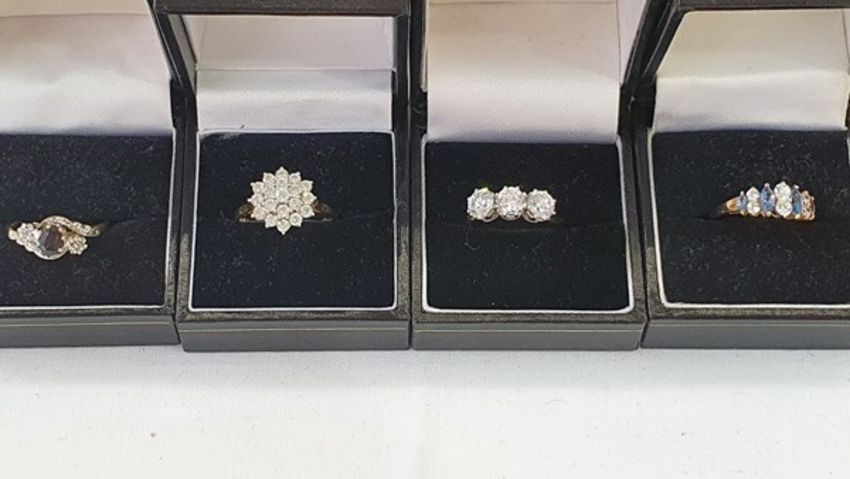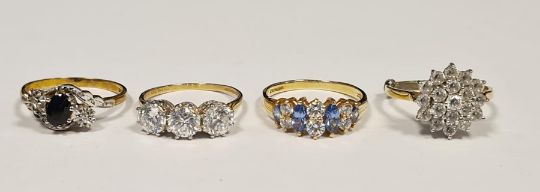 9ct gold, blue and white stone dress ring set oval stone, possibly sapphire, flanked by two very small white stones, probably diamonds, 14ct gold and white stone dress ring set three circular claw-set stones, 14ct gold and cubic zirconia cluster dress ring and 14ct gold, cubic zirconia and blue stone dress ring set four pale blue oval stones and six circular cubic zirconia (4) (all boxed)