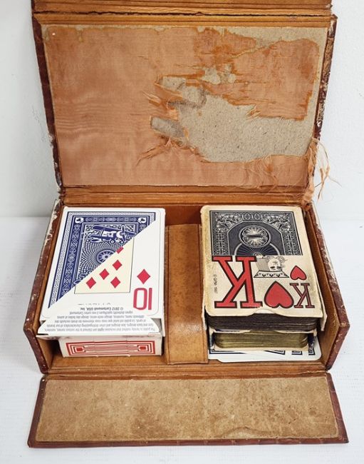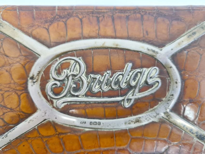 Edwardian silver-mounted and skin, probably alligator, bridge case, the top with silver mounts and silver 'bridge', fitted interior (damaged)