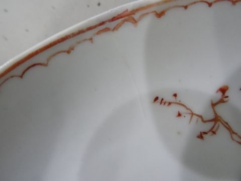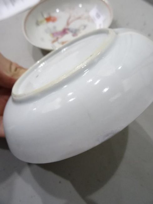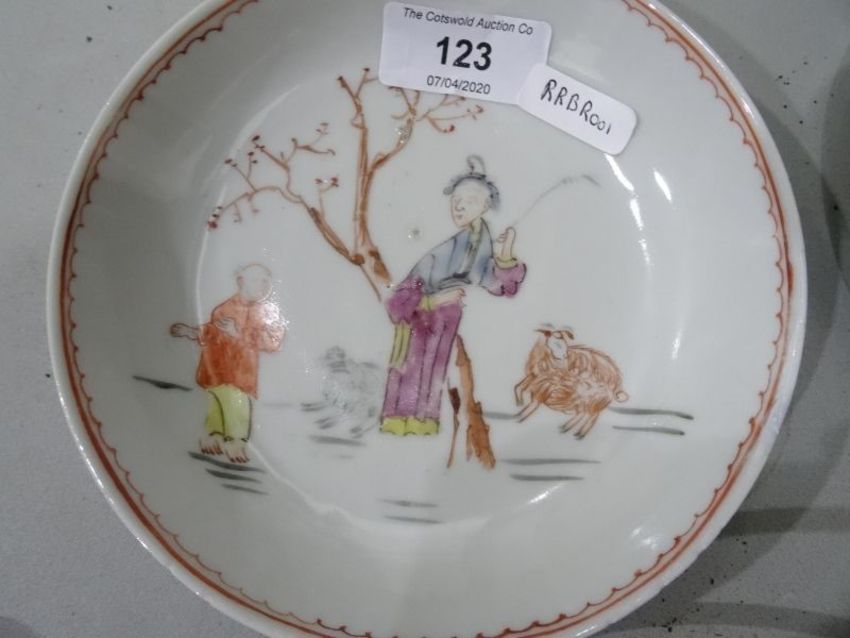 Pair antique Chinese porcelain saucers, each painted with two figures beside tree and sheep, 13cm diameter (2) Condition Reportminor nibbles to both. One with some cracks and a repaired section General wear and tear through out.