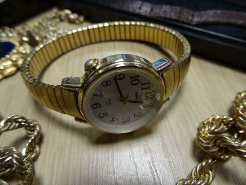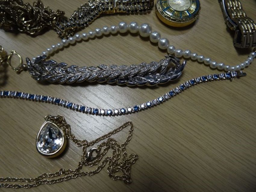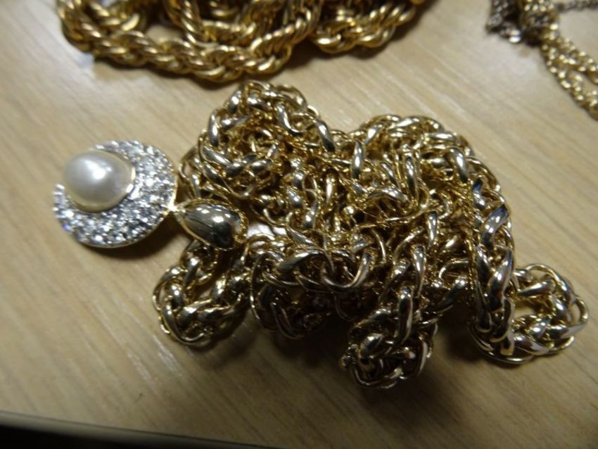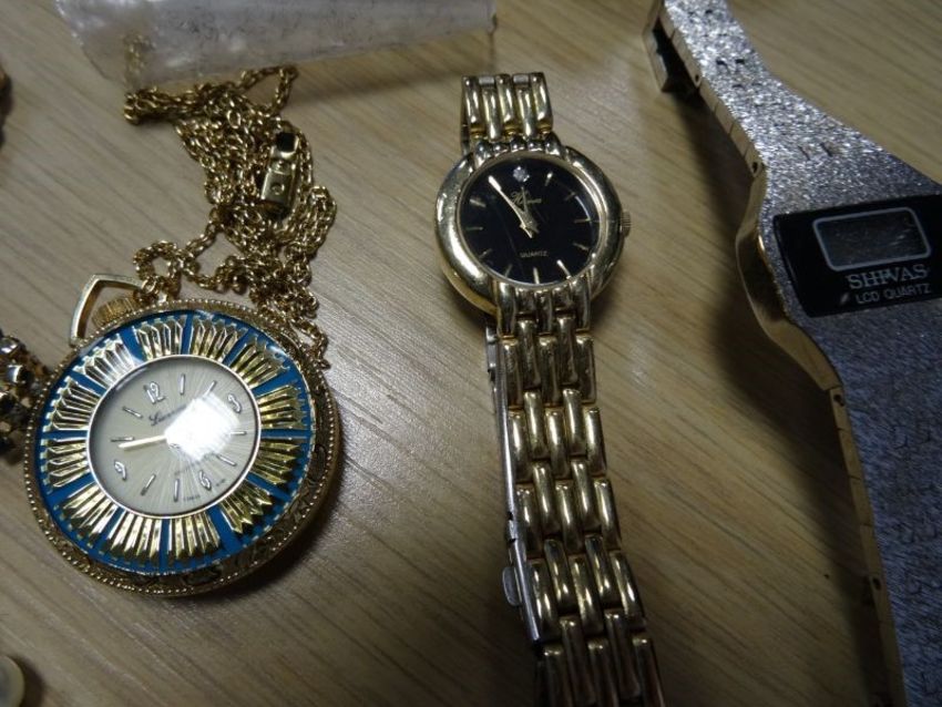 Five lady's wristwatches, a Lucerne gilt metal pendant fob watch on gilt chain, a silver bracelet set with blue and white stones, two other paste set bracelets, a Joan Rivers Collection pendant with interchangeable coloured spheres, quantity of heavy gilt necklaces, pendants and brooches Condition Reportplease see images