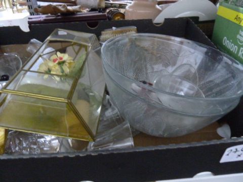 18 piece porcelain tea service, boxed, various vintage biscuit and sweet tins, moulded glassware, a pair of pink ceramic table lamps and other items (5 boxes)