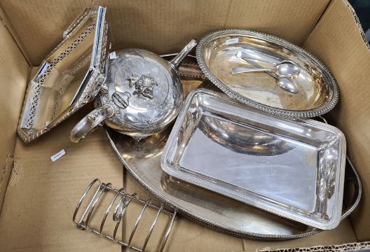 Quantity of plated ware to include candlestick, bowl, dishes, teapots, etc (1 box)