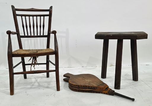 Pair of elm bellows, a pig stool and a child's carver chair (3)