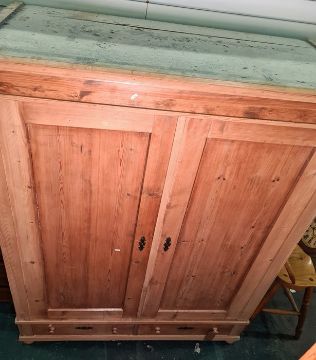 Late 19th century pine wardrobe with two large doors enclosing hanging space, with two short drawers under, raised on squat bun feet, 148cm x 190cm