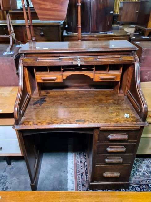 20th century oak roll-top desk on base with eight drawers, raised on plinth, 90cm x 116cmCondition ReportThe width is 90 cm X the height is 116 cm X the depth is 67 cm