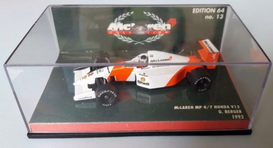 Collection of Formula 1 yearbooks 2002-2009, various signed racing prints and a Stuart McIntyre coloured racing poster, framed, together with a repilica model of Gerhard Berger's 1992 McLaren MP 4/7 Honda V12 car, edition 64, no 13 by Pauls model art, in plastic case