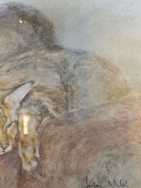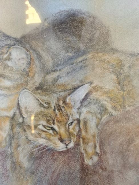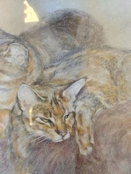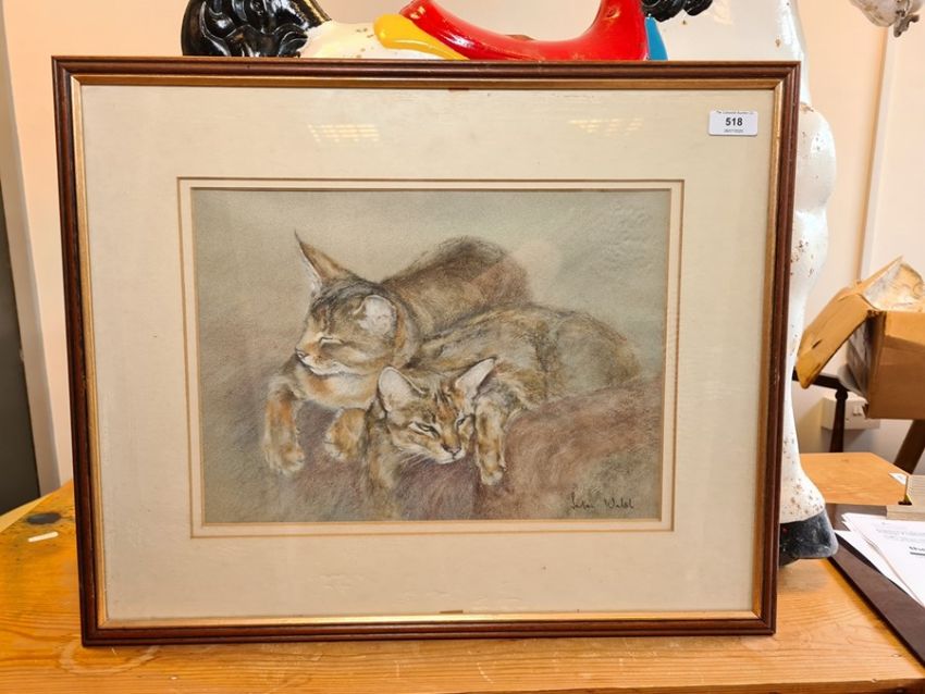Julian Walsh (20th century)Pastel Study of two cats sleeping, signed lower right, 25cm x 35cmCondition ReportThere is some spots of wear to the frame. The back of the cats appear to have faded slightly. The picture is bent inside the frame. See attached images