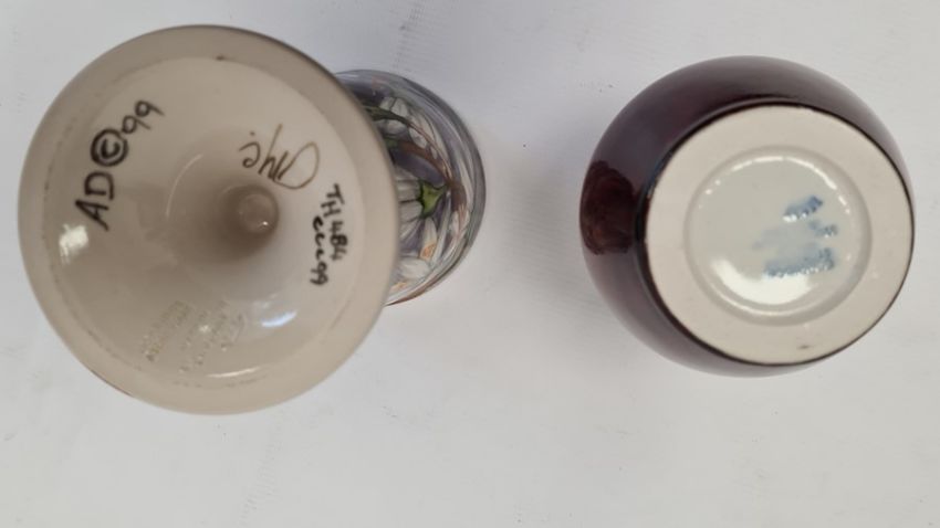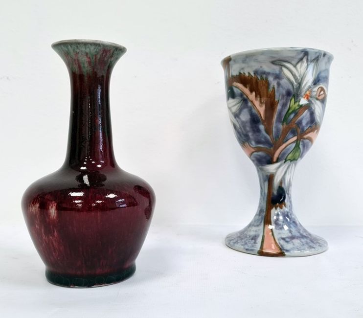 Cobridge glazed stoneware goblet painted with flowering branch, on a lilac ground, initialled indistinctly and dated '99 to base, 16cm high and a Cobridge ruby glazed stoneware bottle vase with tall neck, 15.5cm high (2)