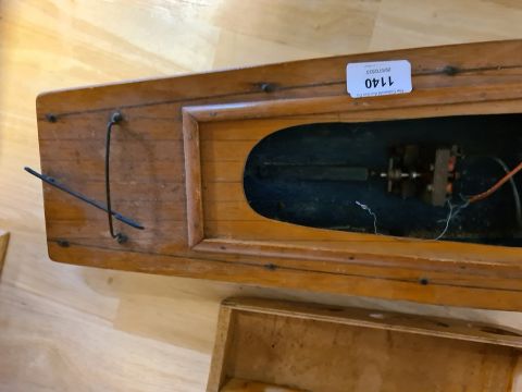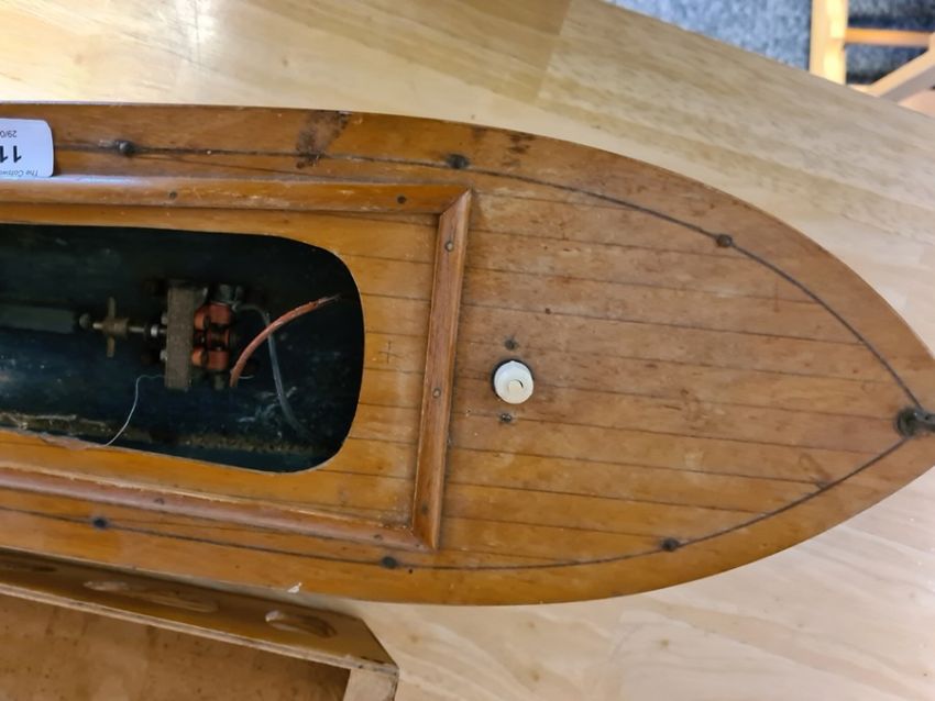 Vintage pond yacht with electric motor Condition ReportInside the yacht the wires are lose and one is not attached and thus does not appear to start. There are lots of chips to the paint on the lower body and bottom. On the top piece there are several small splits to the wood where the nails have been put in. The plastic windows in the top is loose in spots. See attached images