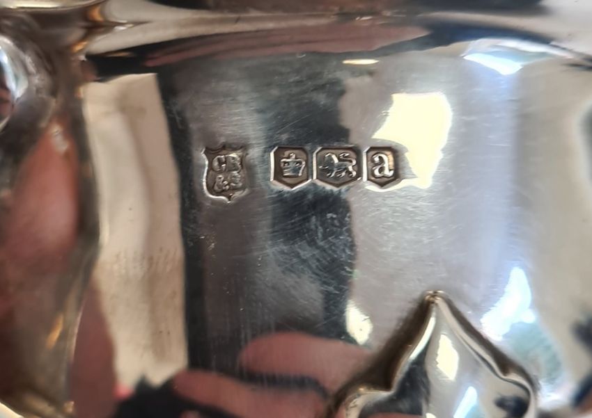 Four-piece silver tea service comprising teapot, hot water jug, two-handled sugar bowl, milk jug and sugar tongs, all with wavy edge border, 47oz total weight