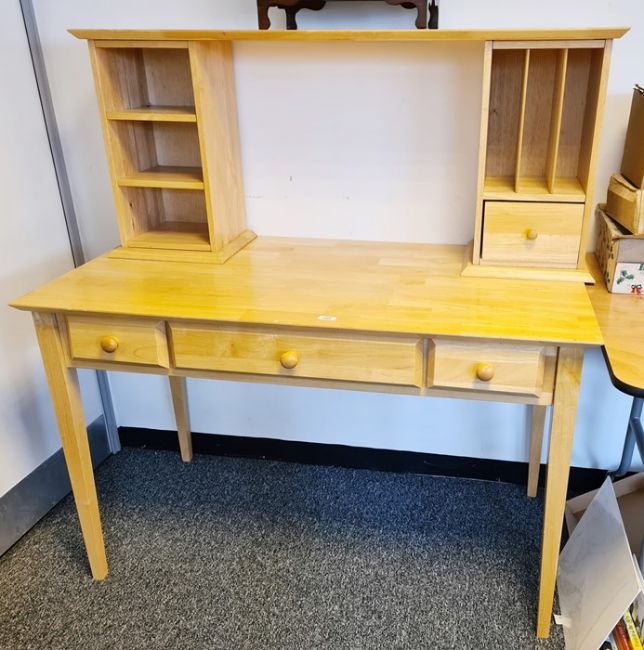 Beech desk, the top with assorted pigeonholes, the base with three drawers, on square section tapering supports, 120cm x 130cm