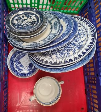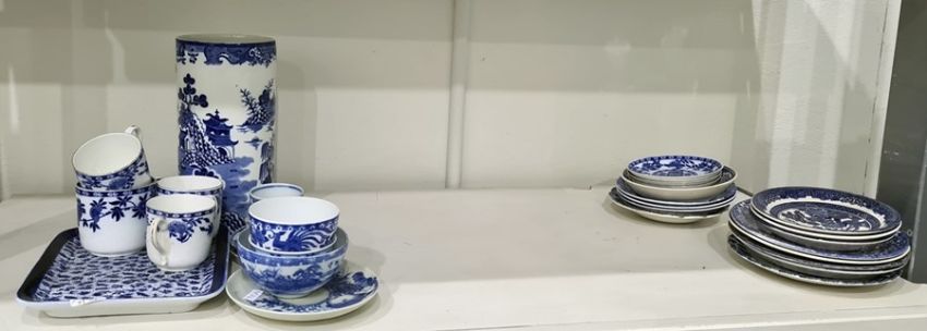 Pair Masons pottery cylindrical vases, willow pattern, sundry meat dishes and other blue and white printed tableware