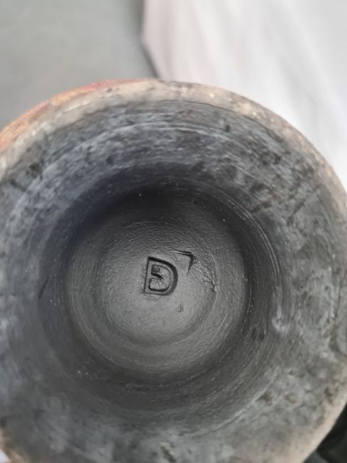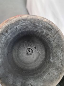 20th Century studio stoneware vase, of goblet from, the interior in a turquoise glazed finish and the exterior in a copper lustre, the base with impressed makers mark to the base (which could be an 'n', 'c' or 'u') 22cm