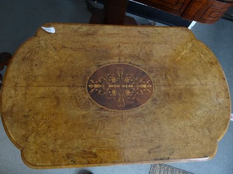 19th century burr walnut and inlaid sewing table, the lozenge-shaped top opening to reveal fitted interior with silk basket, on turned end column supports, to four cabriole legs united by turned stretcher, 62cm x 66.5cmCondition Reportsome warping to the top, some cracks, some lifting of veneer, woodworm holes, general wear and tear.