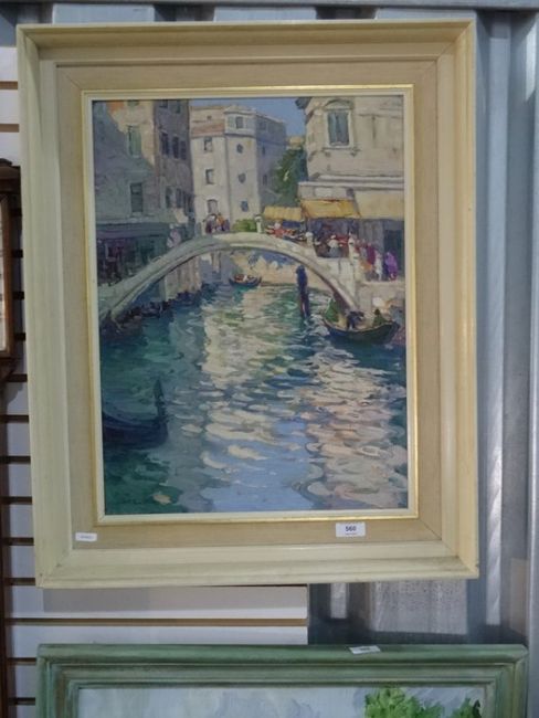 Augustus William Enness (1876-1948)Oil on boardVenetian waterway with bridges and gondolas, signed indistinctly lower left, 55cm x 37cmCondition ReportThis picture is framed but not glazed. See photo