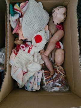 Bisque headed doll impressed JDK, No.257 with composition body (damaged), a quantity of various dolls parts including composition bodies, heads, clothes and wigs (1 box) Condition ReportSee attached images
