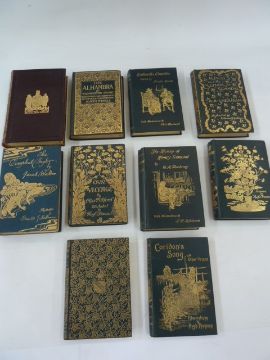 Fine Bindings to include:-Mrs Gaskell"Cranford"  ills Hugh Thomson, Macmillan 1894Sheridan, R B "The Rivals and the School for Scandal", ills by Edmund J Sullivan, Macmillan 1896, very small bkpl inside front board, some offsetting, small sticker inside front board, feint stamp on ffep read 'New Club', name inscription on half-title, stamp New Club on back of frontis, foxing throughoutWinter, William"Shakespeare's England", Macmillan & Co 1893Thackeray, W M "The History of Henry Esmond", ills by T H Robinson, George Allen 1896Jacobs, Joseph (ed) "Goldsmiths Comedies", ills by Chris Hammond, George Allen 1896, name written on ffep both sides, stamp for Deighton Bell & Co, CambridgeWalton, Izaac "The Compleat Angler - New Edition edited with an introduction by Andrew Lang ...", J M Dent 1896Dobson, Austin (intro) "Coridon's Song and Other Verses ...", ills by Hugh Thomson, Macmillan & Co 1894, tissue guard foxed, small booksellers plate inside front boardMiss Mitford"Our Village", MacmIllan & Co 1893, tissue guard foxed, small booksellers plate inside front boardScott, Sir Walter"The Lady of the Lake", A & C Black 1891, numerous ills by Birket Foster and Sir John Gilbert, Kings College London prize bkpl inside front board, maroon cloth, gilt crest for the college front board, raised bands and gilt decorations and title to the backstrip, blindstamp rules to boards, gilt dentelsIrving, Washington"The Alhambra", ills by Joseph Pennell with an introduction by Elizabeth Robins Pennel, Macmillan & Co 1896, frontis tissue guard, tp foxed, foxing throughout,  all bright pictorial cloth, all a.e.g. (10)