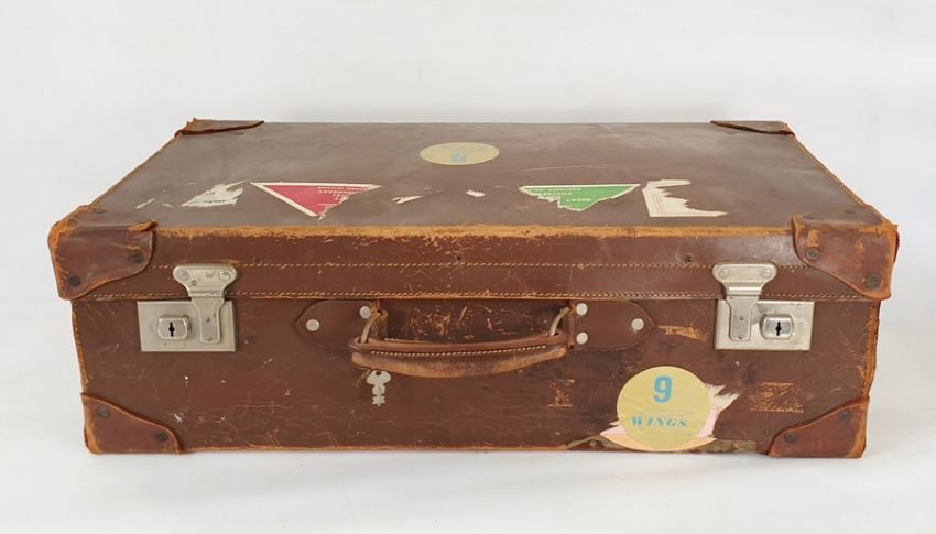 Vintage leather suitcase bearing luggage labels
