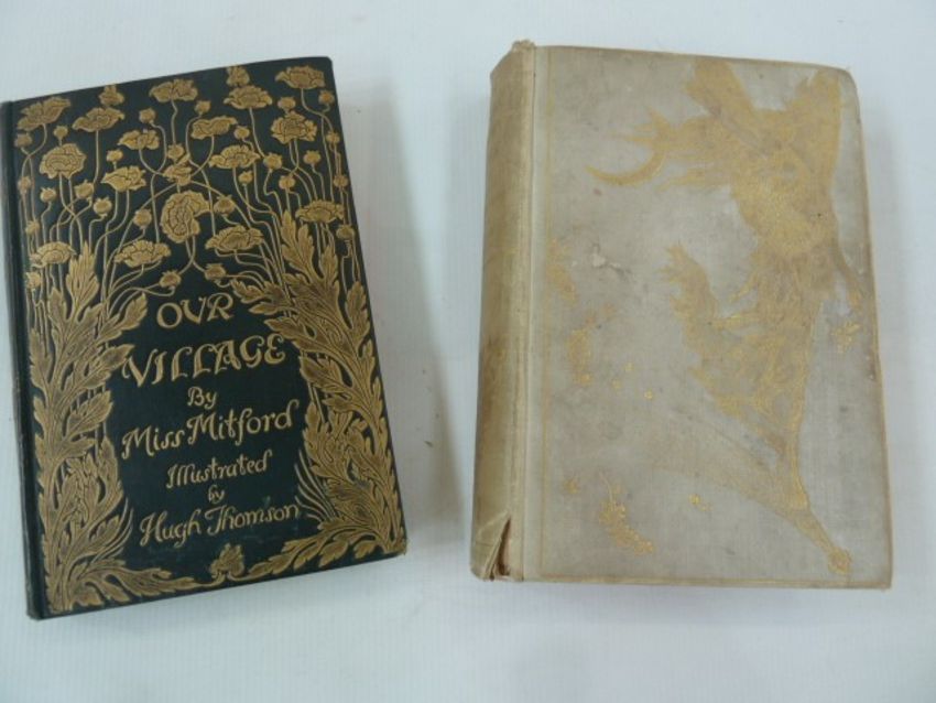 Quantity of children's books, pictorial bindings and find bindings, to include:-Lang, Andrew (ed) "The Lilac Fairy Book", ills H J Ford, Longmans Green & Co 1910, inscriptions on ffep, front board detaching, the whole rather bumped and stained, the backstrip splitting, a.e.gThomson, Hugh (ills) "Our Village by Miss Mitford", MacMillan & Co 1893, address label stuck on ffep, corners rubbed and top of spine backstrip splitting, pictorial clothHeaton Cooper, A and Palmer, W T"The English Lakes", Adam & Charles Black 1908, inscription on ffep, front hinge cracked, pictorial cloth but backstrip fadingMacDonald"The Princess and Curdie", ills by Helen Stratton, Blackie & Son, address label inside front board, inscription written back of the frontis, other authors including Rudyard Kipling, Raymond Briggs, R M ValentineDore, Gustav (ills)"The Adventures of Baron Munchausen", Cassell Petter & Galpin, front board detaching, binding loose, the whole very worn, small folio, poetry, etc (1 box)