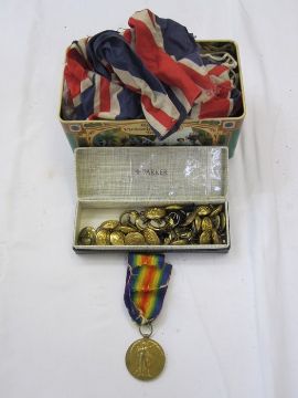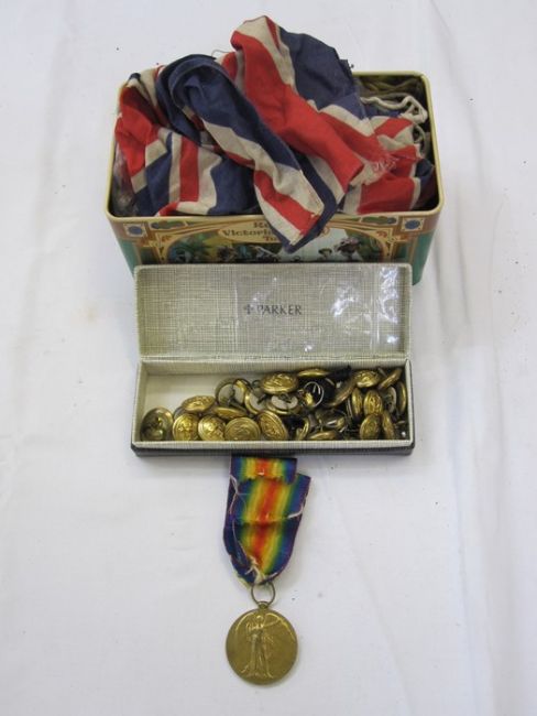 Quantity brass military buttons, Naval, length of Union Jack bunting and a 1914-19 Victory medal 6650.F.WOODMANSEY.35B.N. A.I.F. KIA 25/08/1918 (2 boxes)