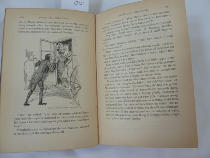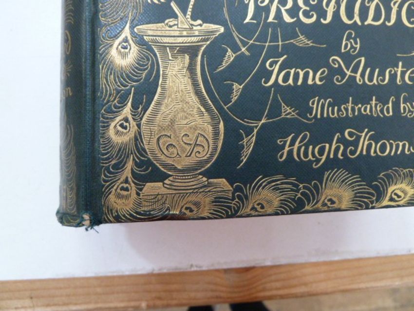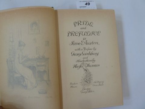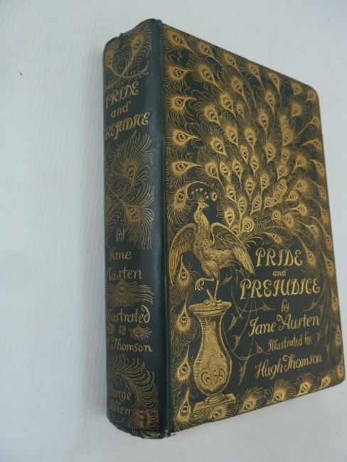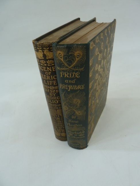 Thomson, Hugh (ills) Austen, Jane "Pride and Prejudice", George Allen, n.d. Chiswick Press, frontis with tissue guard, facsimilie  please note ,inscription 'to J Comyns Carr from Hugh Thomson' , letterpress ills throughout, gilt pictorial boards 'Peacock Series', a.e.g., slightly cocked, small wear to the corners and to the bottom of the backstrip, pencil inscription of date and £20.00 ffepEliott, George"Scenes of Clerical Life", ills by Hugh Thomson, MacMillan & Co 1906, colour frontis with tissue guard, colour plates and ills, inscription dated 1911 on ffep, green pictorial cloth showing pastoral scene of shepherd and sheep, slight wear to top of backstrip, both copies clean and bright (2)
