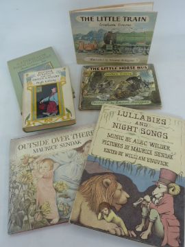 Lofting, Hugh"Doctor Dolittle and the Green Canary", Jonathan Cape 1951, colour frontis, ills tp, ills throughout, pictorial ep, turquoise cloth with black titles, dj price clipped, glassine coverArdizzone, Edward (ills) "Ardizzone's Hans Andersen", Andre Deutsch 1978, colour plates, ills, decorated ep, maroon cloth with gilt titles and decoration, dj not price clipped, glassine coverGreene, Grahame"The Little Horse Bus", ills Edward Ardizzone, The Bodly Head 1974, colour ills, oblong 8vo, pictorial boards, dj price clipped"The Little Train", The Bodley Head 1973, colour ills, pictorial boards, dj price clipped, oblong 8voSendak, Maurice"Outside Over There", The Bodley Head 1981, ills half-title, ills tp, ills dedication, ills, red cloth, gilt titles, dj not price clipped"Lullabies and Night Songs", pictures by Maurice Sendak, edited by William Engvick, half-title, ills tp, ills music scores, decorated pictorial boards, dj price clipped, small folio (6)