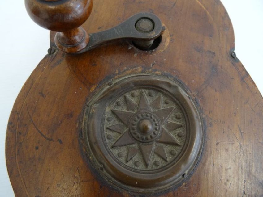 French mahogany and brass-finish metal mounted mechanical bellows having baluster turned handle, winding arm with wooden knob, pierced vent and brass-finish metal tapering nozzle, stamped indistinctly to reverse but probably 'Metay and Mercier, Paris'Condition ReportSome dents to the metalwork, top panel of the body detached at the handle end, small scratches and signs of wear throughout
