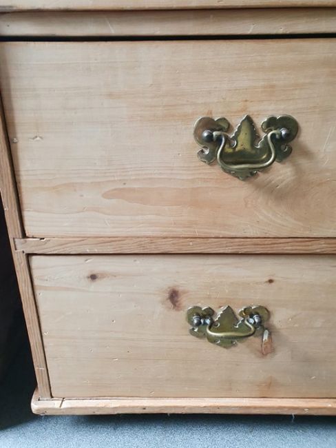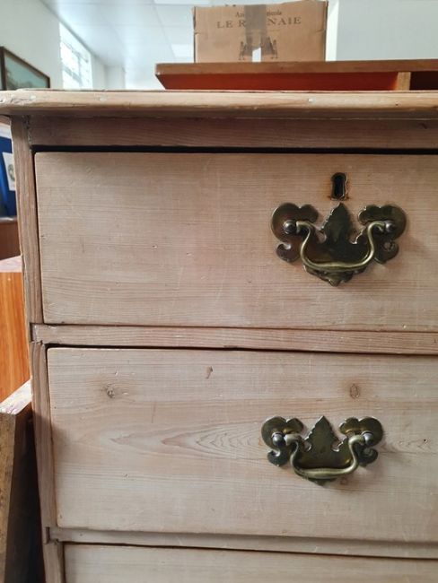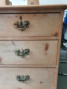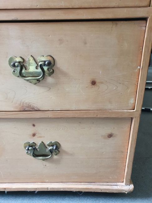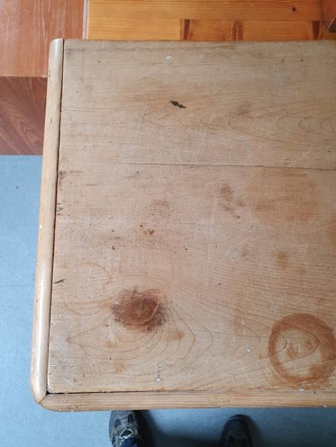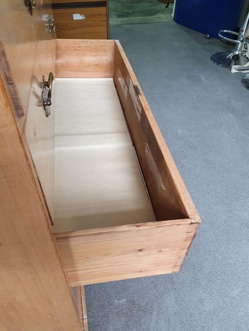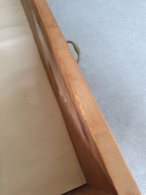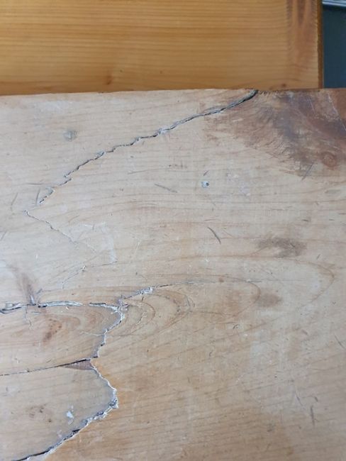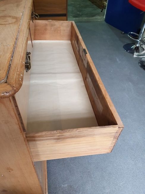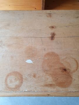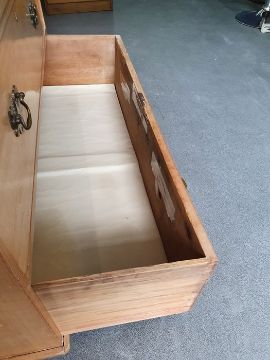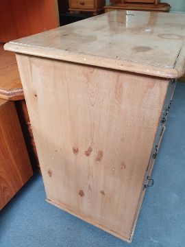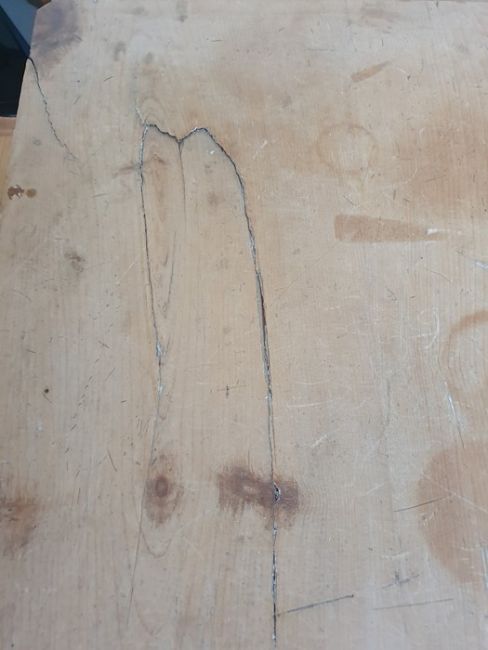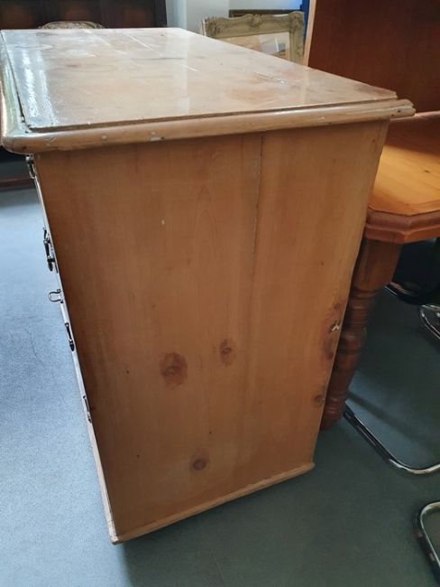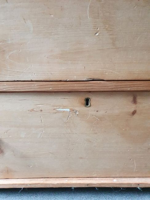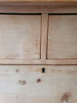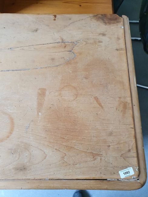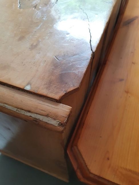 Numerous surface scratches, scuffs and knocks, white filler in places. Large split to the top, area of loss to the back right corner. general wear and tear. See photos102 w x 89cmh, total depth 52cm