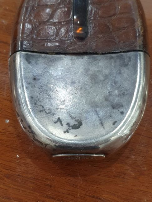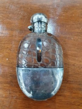 Early 20th century silver and leather-mounted glass hip flask, Sheffield 1903, Walker & Hall, a silver-coloured metal shooting cup in fitted leather case and a silver-lidded pin case with engine-turned decoration and engraved fox to lid, 2oz approx (3) Condition ReportThe hip flask has surface scratches to both the silver and glass, tarnishing and accretions, small dents to the cap. The hip flask is water tight, it is corked so not currently usable. The leather has numerous scuffs and scratches. Flask still has some liquid inside.