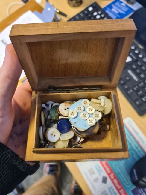 Wooden box  with buttons, a rectangular turquoise cloisonne box, a wooden puzzle, a red lacquered Oriental box depicting figures in a landscape (hinge broken) and a travelling mirror (5)