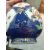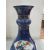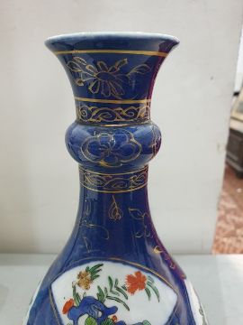 19th century Chinese porcelain powder blue ground famille verte bottle-shaped vase with blue Kangxi leaf mark to base, painted with lappet-shaped cartouches enclosing vases, precious objects, flowering prunus and chinoiserie flower sprays, reserved on a powder blue ground, gilt with loose flower sprays (base drilled), 25.5cm high Condition ReportSome minor wear to areas of the gilt. Base has been drilled but otherwise fair condition.  General wear and tear.  See attached photos