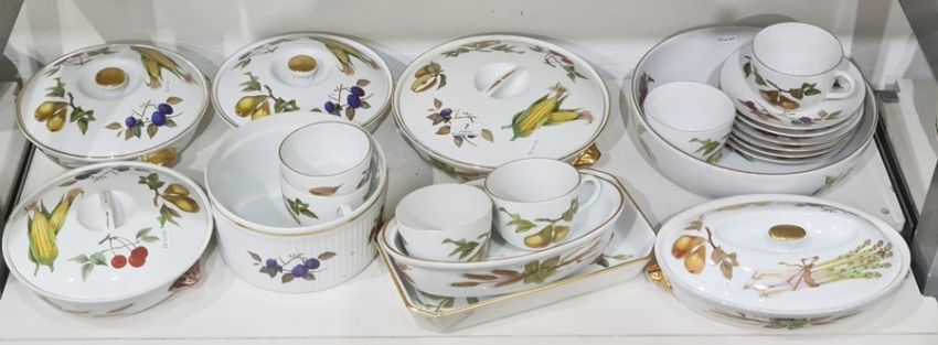 Royal Worcester 'Evesham' pattern part dinner and coffee set to include bowl, five teacups, saucers, sugar bowl and various serving dishes