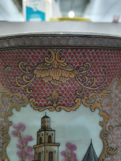 Chinese export-style waisted cylindrical vase and cover, printed, painted and gilt in the 18th century Chinese famille rose style, with huntsmen and hounds in landscape, within black edged gilt rocaille scroll cartouches, the ground enamelled and gilt with geometric and scale pattern, 30cm high Condition ReportOverall good condition with some light surface scratches, very minor wear to some of the gilt, accretions. In need of a good clean.  General wear and tear. See attached photos.