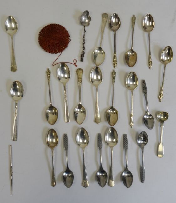 Quantity of assorted silver and plated teaspoons to include an Oriental(?) silver teaspoon with serpent wrapped around handle, 0.4oz, plated apostle spoons, etc (1 box)