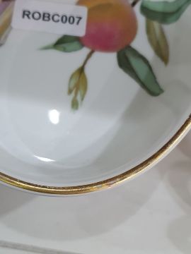 Royal Worcester 'Evesham' pattern bowl, serving dishes and ceramic circular cheese board and Mintons part dinner and breakfast service in the 'Cuckoo' patternCondition ReportThe Evesham items have some light surface scratches and minor wear to the gilt.The Mintons items have some light surface scratches, accretions, wear to the gilt and some yellowing/discolouration to some of the pieces. One of the teacups has a crack to the rim, two of the plates have cracks, one of the coffee cans has a crack to the rim, the cream jug has a small chip to the rim.General wear and tear commensurate with age and use, see photos for more details.