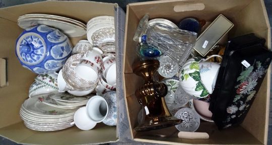 Two boxes of glass and ceramics including various part tea services such as Royal Swan, Queen Anne and Gainsborough patterns, Gold Lustre two handled urn, plus quartz mantel clock and two black lacquer flower decorated boxes. (2)