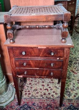 Mahogany side table of three drawers, square section tapering supports and a cane seated stool (2)