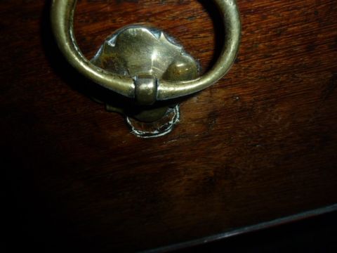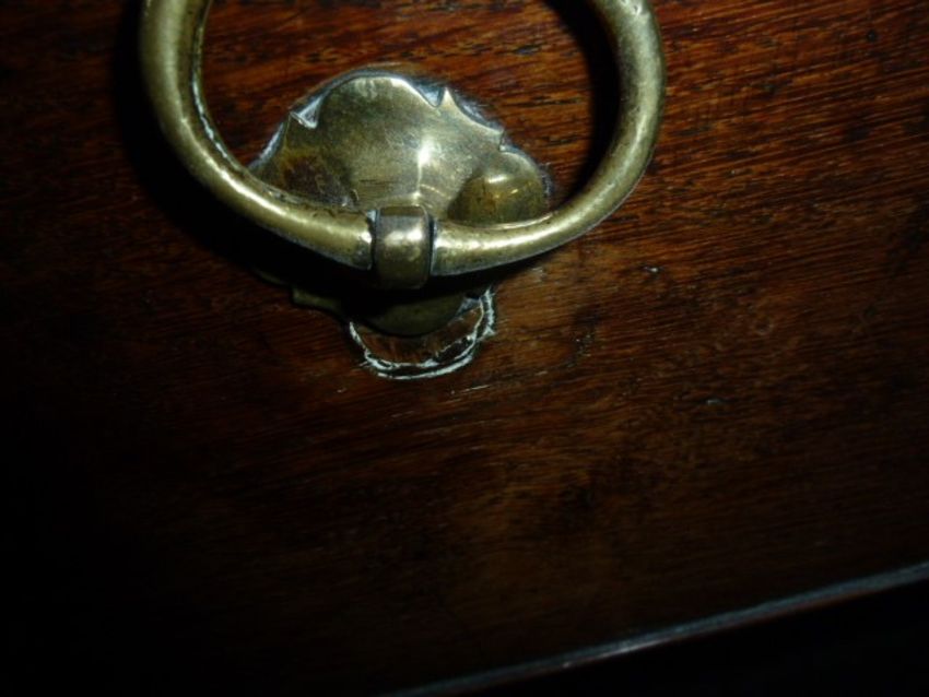 18th century oak low dresser with three short deep drawers and pair shallow drawers, all with cockbead borders and brass drop-ring handles, having shaped apron, on square tapering supports, 194cm wide Condition ReportHeight 91cmLength 194cmDepth 45cmPlease see attached images. The handles are not original and one is missing. The top is splitting as shown, unfortunately the sideboard is locked in by other furniture so we cannot get to the back or sides or even underneath.. the patina is lovely.The piece has commensurate wear and tear with its age and use. No obvious worm damage. The drawers slide well  .