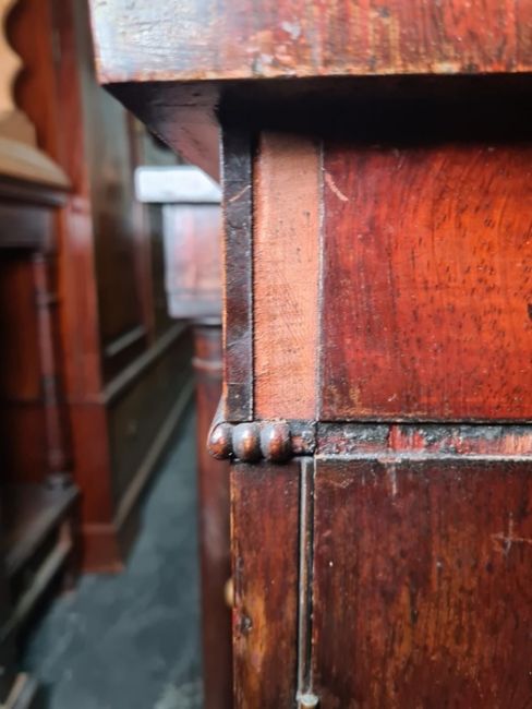 The handle is missing from the middle door. There chips to both sides of the top. There is wear to the front of the shelve, the back section is loose. The mirror has some wear to it as well as the back. The metal is loose from the top. See attached images.