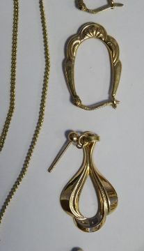 9ct gold crucifix on 9ct gold chain, a pair of 9ct gold hoop earrings, another gold hoop earring and other 9ct gold earrings