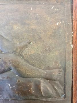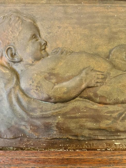 Benjamin Creswick (1853-1946) painted plaster plaque in rectangular wooden frame "Sam's Baby", with City Museum & Art Gallery, Chamberlain Square, Birmingham label verso, dated 15/11/86 and 25/01/87, 15.5cm x 27.5cm (not including frame) Condition ReportThere are quite a few spots of white paint the piece. The frame is scratched in several places. See attached images.
