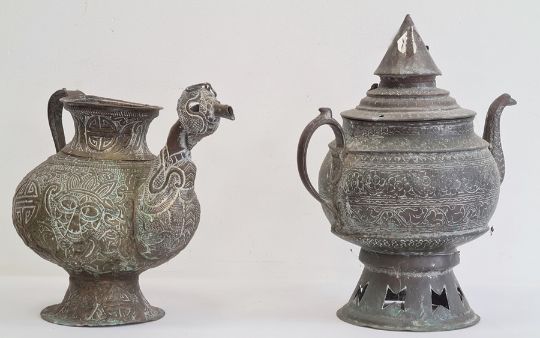 Two Asian copper tea kettles, each of globular form, the first with cover and spire finial, the first decorated in repousse with scrolling flowerheads and scale-pattern spout, on raised pierced foot, 36cm high, the second with Buddhistic symbols, masks and scrolling foliage and stylised mask spout, on spreading foot, 25cm high (2)