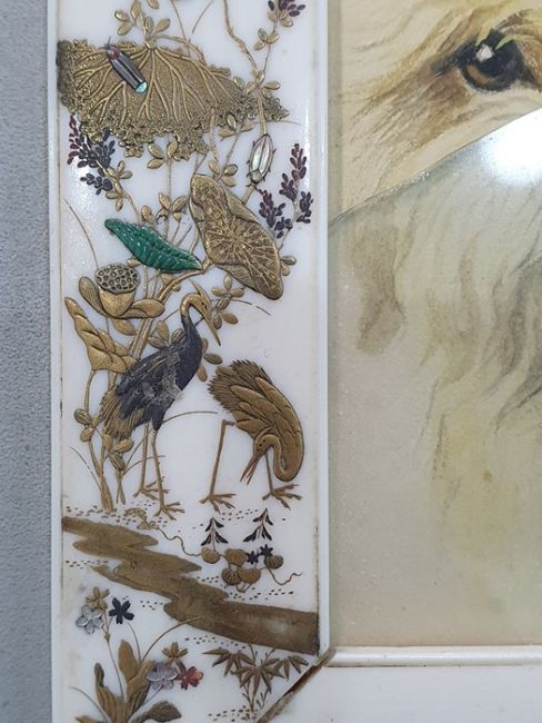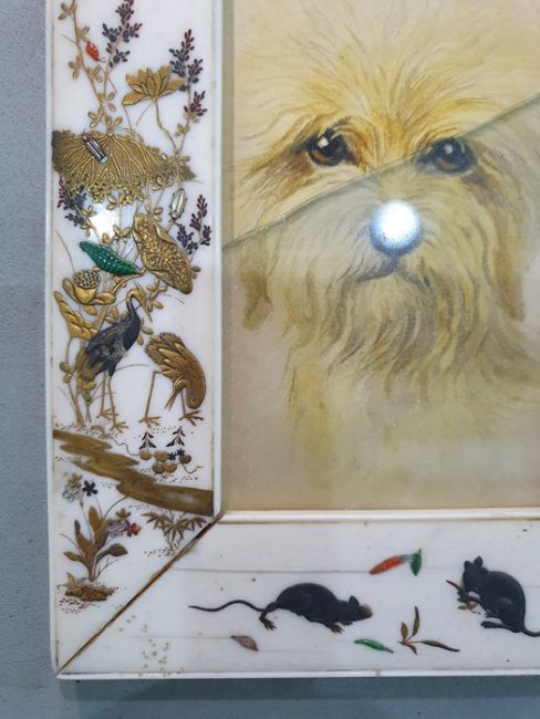 Late 19th century Japanese ivory frame, of rectangular section, the panels lacquered, gilt, enamelled and applied with mother-of-pearl cranes, insects, mice and peacock amongst loose flower sprays, enclosing a watercolour portrait of a dog, 14.5cm x 11cm  Condition ReportGlazed glass panel is cracked and partially lacking.  The reverse is sellotaped.  Size of frame is approx 14.5cm x 11cm