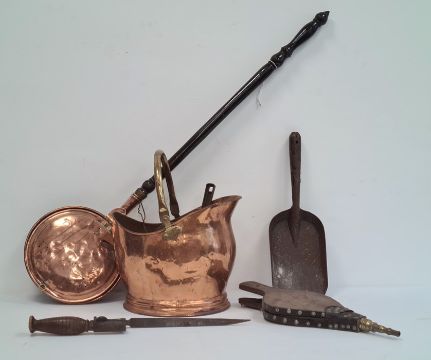 Copper warming pan, a copper coal scuttles, bellows and other fire tools