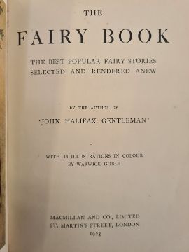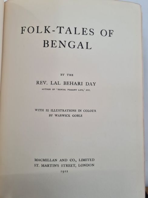 Goble, Warwick (ills)"Folk Tales of Bengal by the late Rev Lal Behari Day", Macmillan & Co 1912, colour frontis with paper guard, colour plates with paper guards, hinges cracked, pen inscription on ffep dated 1913, red cloth, gilt pictorial boards and decorationsGoble, Warwick (ills)"The Water Babies, the Fairytale for a Land Baby", 1927, colour frontis, other colour plates, red cloth, pictorial front board, gilt titlesGoble, Warwick"The Fairy Book", Macmillan & Co 1923, colour frontis, colour plates, uniform with the previous book (3)