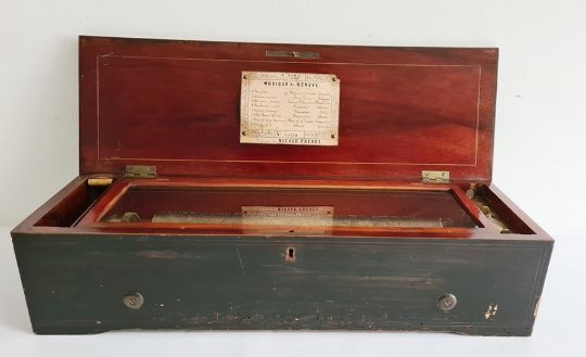Nicole Freres Eight Air cylinder music box, Swiss, late 19th century, playing eight Airs, in rosewood veneered case with marquetry inlay, numbered 41179, 13'' cylinder, 51.5 x 13 cmCondition ReportSee further images; no visible missing teeth or teeth tips