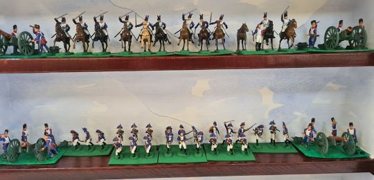 A quantity of lead painted soldiers, (loose) three on horse back and three holding rifles and a quantity of painted soldiers in two wooden display cases
