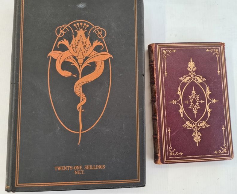 Webster, John "The Duchess of Malfi and The White Devil - two plays ...", illustrated by Henry Keen, John Lane, The Bodley Head, frontis, plates, decorated ep, black cloth with gilt decorations, titles and rules, black dj with orange decorations and 21 shillings written to the frontBrickdale, Eleanor F (ills)"The Idylls of the King", Alfred Tennyson, Hodder & Stoughton n.d., colour frontis tipped in with tissue guard, colour plates tipped in with tissue guards, ep showing the sword of Arthur, gilt decorated cloth but bumped and rubbed, damp damage, backstrip splitting, has been re-backedThomson, Hugh (ills)"The School for Scandal by Richard Brinsley", Hodder & Stoughton, n.d., colour plates tipped in, black and white illustrations, decorated tp, wear to the tp and frontis, decorated ep, front board detaching, purple cloth with gilt decorations but suffering badly from damp damageTennyson, Alfred "Idylls of the King", Edward Moxon & Co 1862, fine binding, gilt decorated full morocco, a.e.g. but all corners bumped (4)