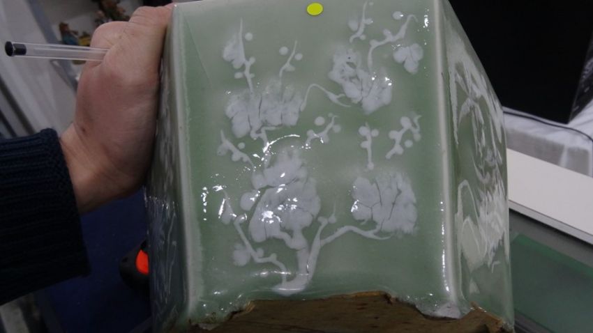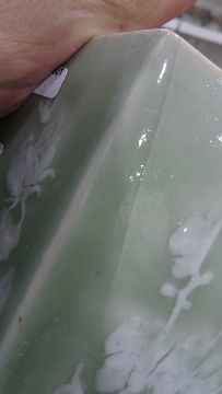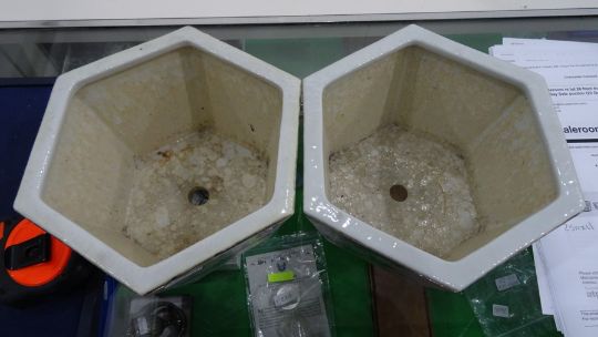 Pair of hexagonal 20th century Chinese jardinieres, the tapering bodies with each side decorated with various figures, raised on bracket feet, 12cm high and a 20th century Chinese jardiniere with celadon green ground, floral decoration, the whole of hexagonal form and tapering body terminating to bracket feet, 16.5cm high (3) Condition Report2 small ones no obvious cracksbig one - chips/losses to all feet. crack to side. general wear and tear throughout
