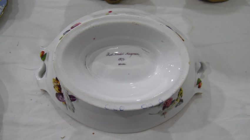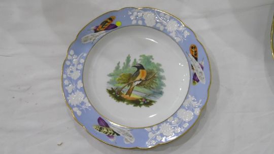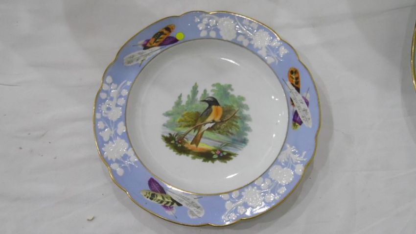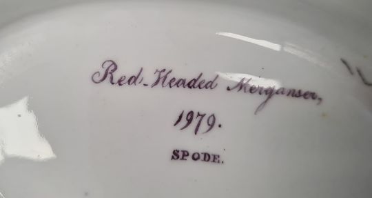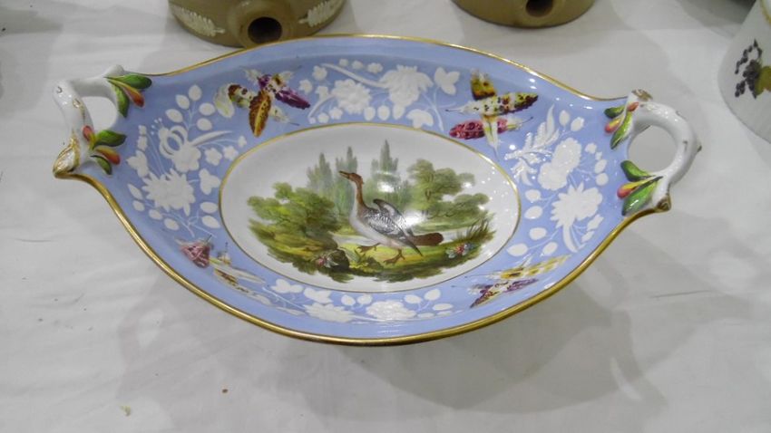 Two 19th century Spode Ornithological porcelain plates in Red Start and Goosander, circa 1820, pattern no. 1979 and a two-handled centrepiece 'Red Headed Merganser', pattern no.1979 (3) Condition ReportThe Gossander dish measures 26.5 x 17 cm. There are no obvious cracks or damage, some rubbing of gilding.The Redstart plate is 22cm diameter. There are no obvious cracks or damage, some rubbing of gilding.The Merganser centre piece is 36 x 24 x 15high (cm). There are no obvious cracks or damage, some rubbing of gilding, there is an original casting flaw on the underside.